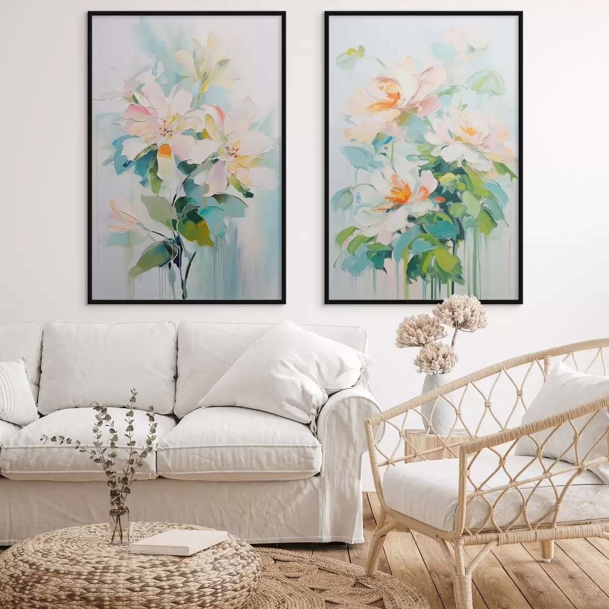 Poster Weiß und Pastell Pfirsich Blumen, grüne Blätter, weiche Pinselstriche Ölgemälde Nachahmung, hellblauem Hintergrund d00644