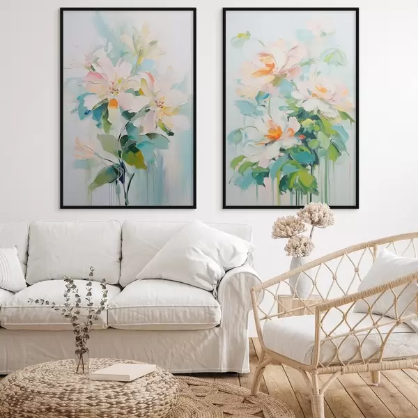 Poster Weiß und Pastell Pfirsich Blumen, grüne Blätter, weiche Pinselstriche Ölgemälde Nachahmung, hellblauem Hintergrund Nr d00644