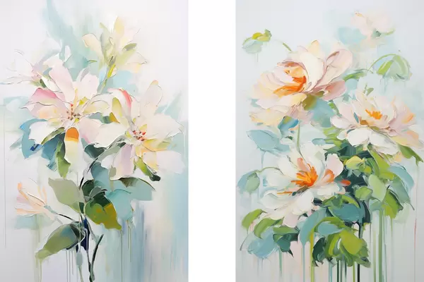 Poster Weiß und Pastell Pfirsich Blumen, grüne Blätter, weiche Pinselstriche Ölgemälde Nachahmung, hellblauem Hintergrund Nr d00644