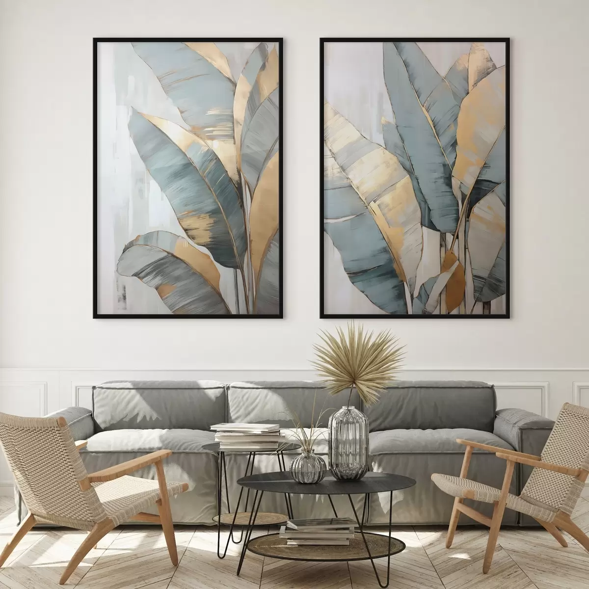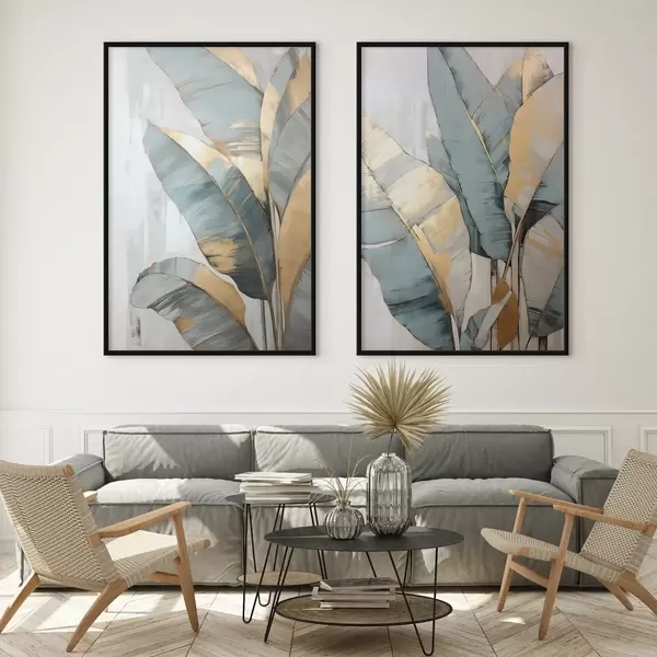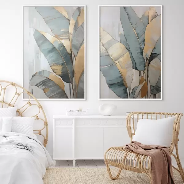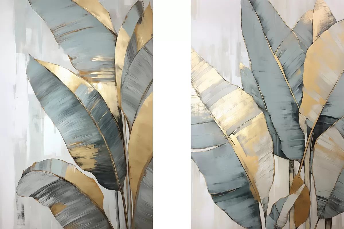 Poster Eine Reihe von gedämpften blauen, grauen und gelben Bananenblättern mit sichtbaren Pinselstrichen vor einem weißen abstrakten Hintergrund d00645