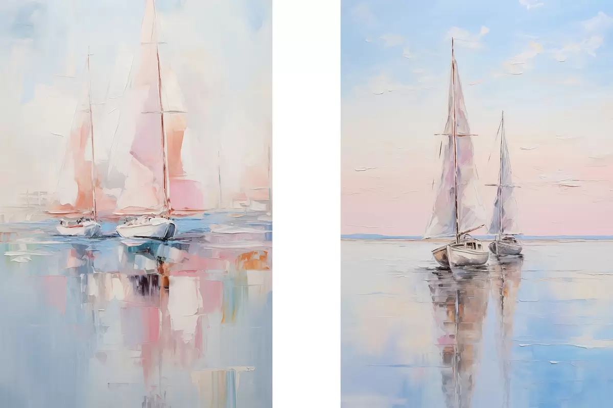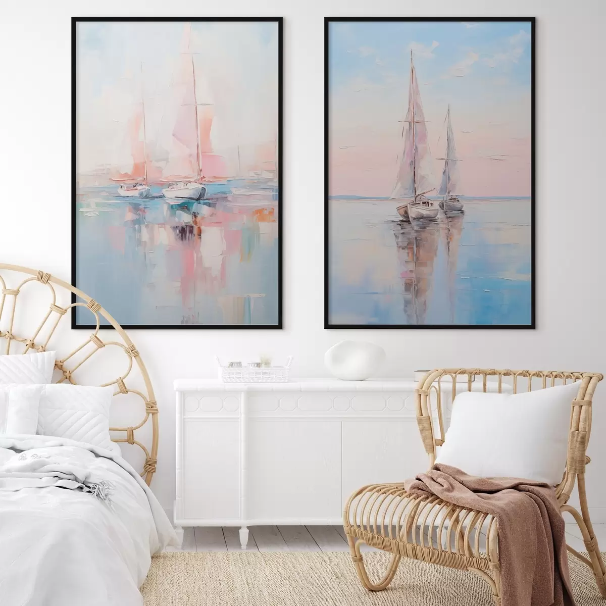 Poster Segelboote mit rosafarbenen Segeln, die auf einer ruhigen See treiben, Spiegelungen der Boote im Wasser, sanfte Pastellfarben Nr d00648