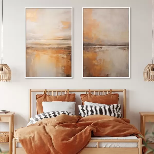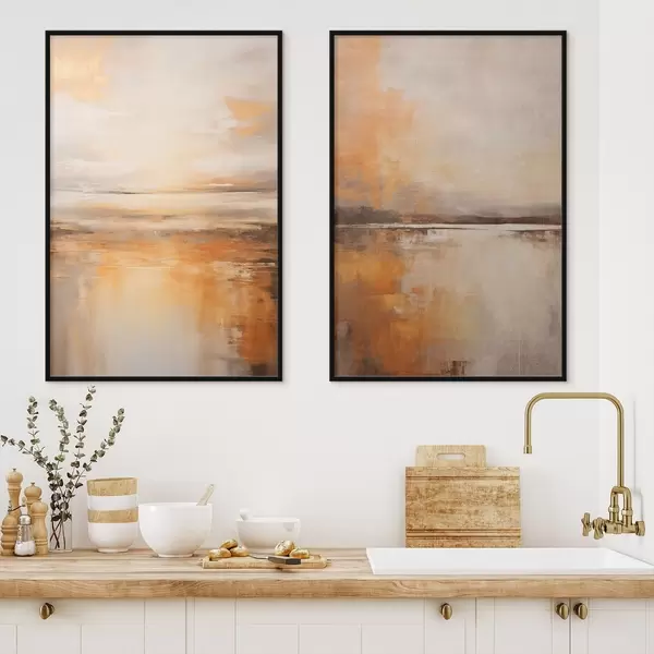 Poster Ein abstraktes Gemälde von einer Strandlandschaft mit einem ruhigen Meer, orangefarbenem Sand und einem bewölkten Himmel mit Sonne Nr d00653