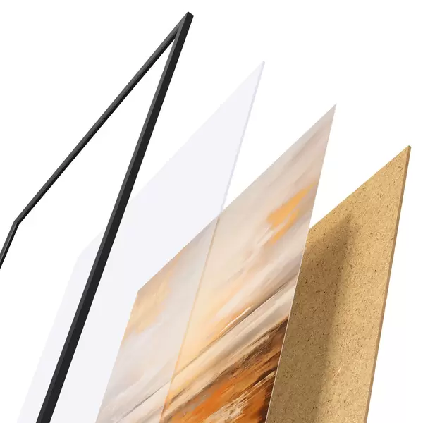 Das Poster besteht aus einem Rahmen, Plexiglas, einem gedruckten Bild und einer Rückwand aus Spanplatten. Dank der Halterungen auf der Rückseite kann das Poster sofort an die Wand gehängt werden.