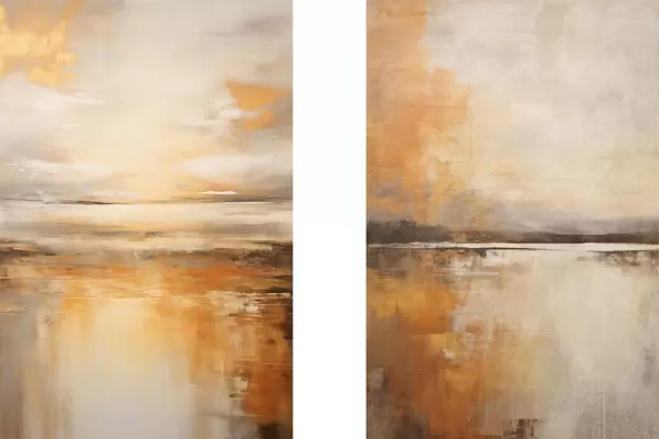 Poster Ein abstraktes Gemälde von einer Strandlandschaft mit einem ruhigen Meer, orangefarbenem Sand und einem bewölkten Himmel mit Sonne Nr d00653