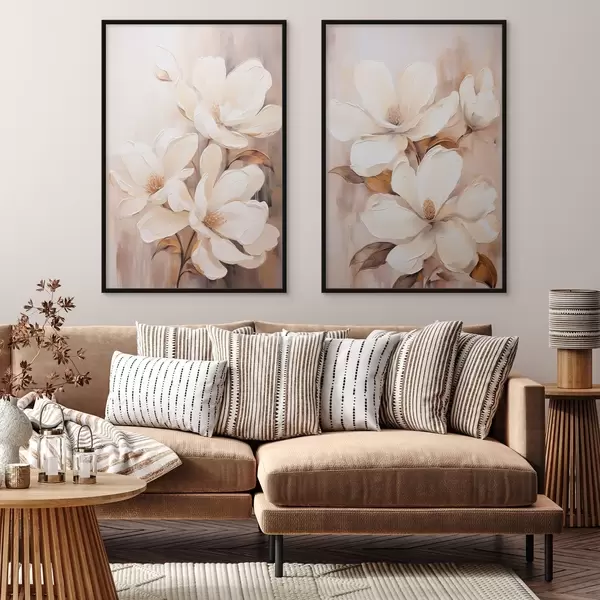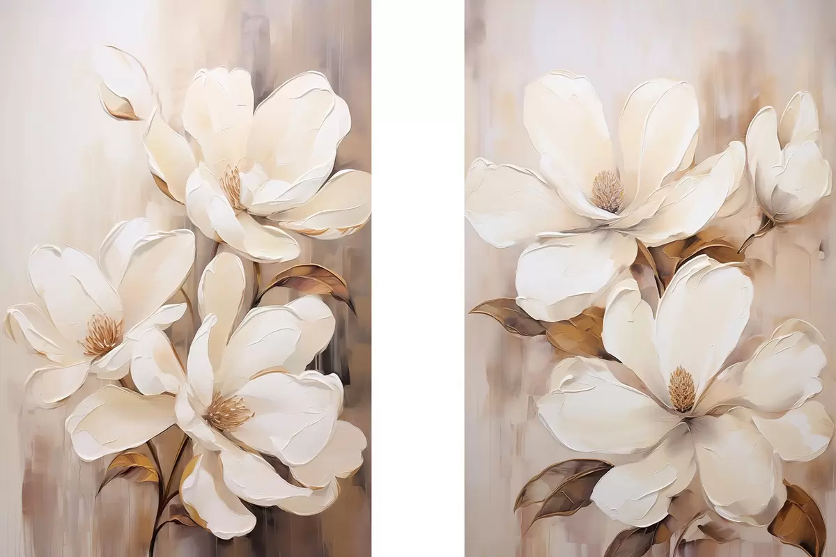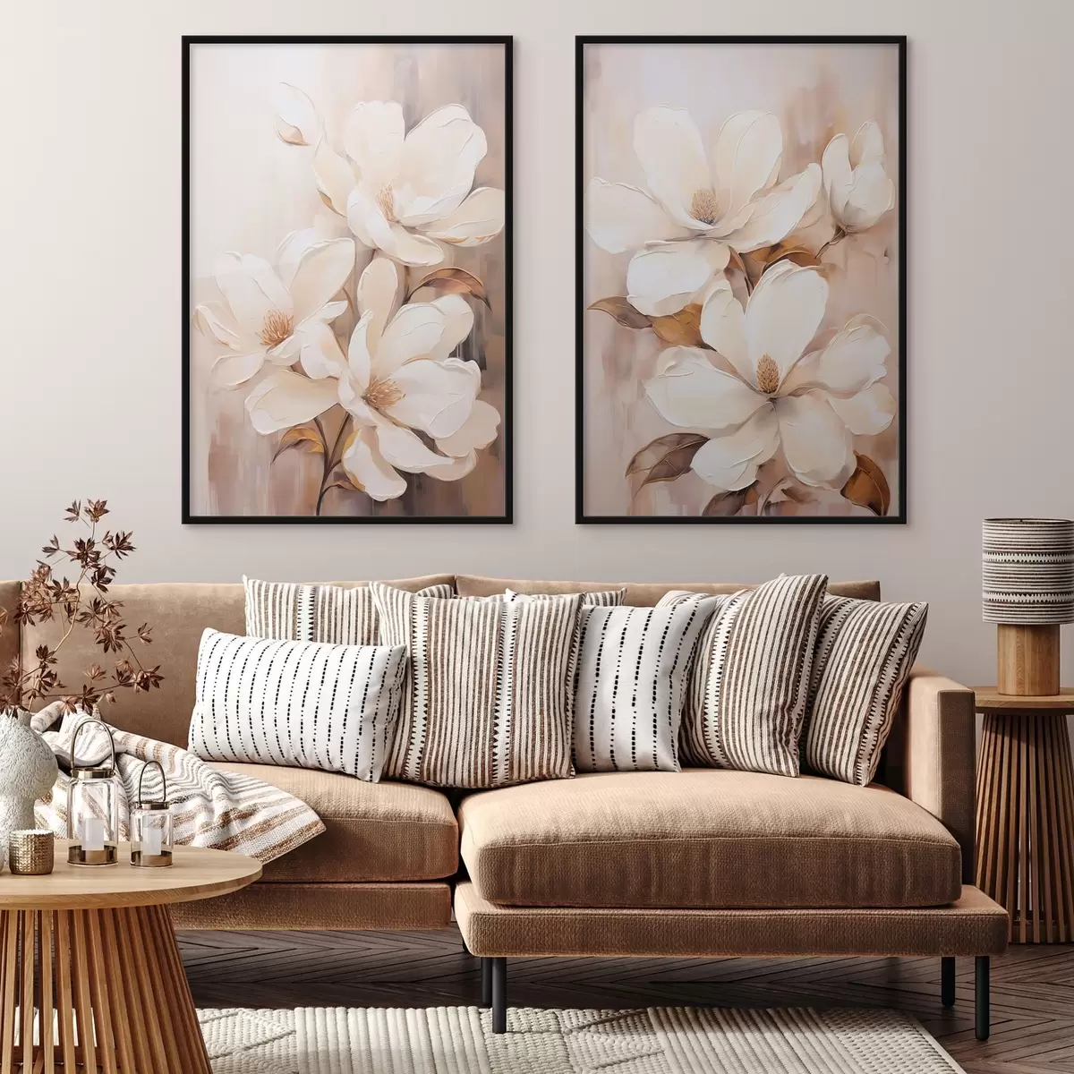 Poster Weiße Magnolienblüten vor einem weichen, unscharfen Hintergrund aus Beige- und Brauntönen, Malstil d00655