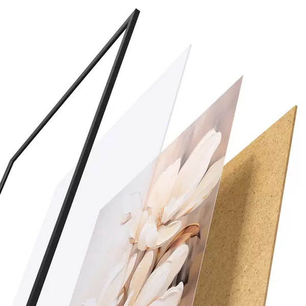 Das Poster besteht aus einem Rahmen, Plexiglas, einem gedruckten Bild und einer Rückwand aus Spanplatten. Dank der Halterungen auf der Rückseite kann das Poster sofort an die Wand gehängt werden.