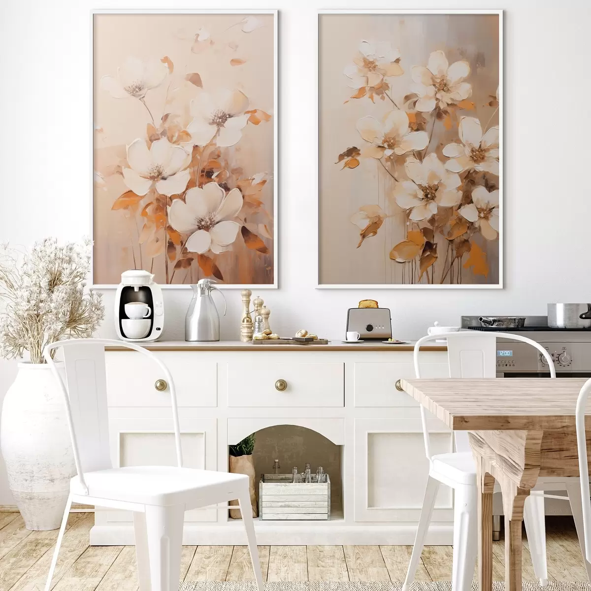 Poster Weiße Blumen mit orangefarbenen Blättern, zarte Pinselstriche, warme Farbpalette, elegante Komposition Nr d00656
