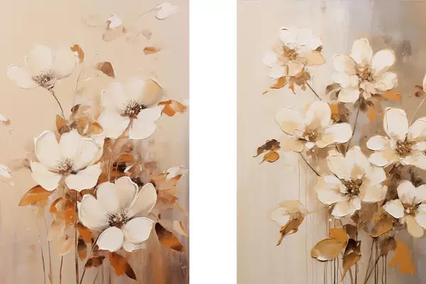 Poster Weiße Blumen mit orangefarbenen Blättern, zarte Pinselstriche, warme Farbpalette, elegante Komposition Nr d00656