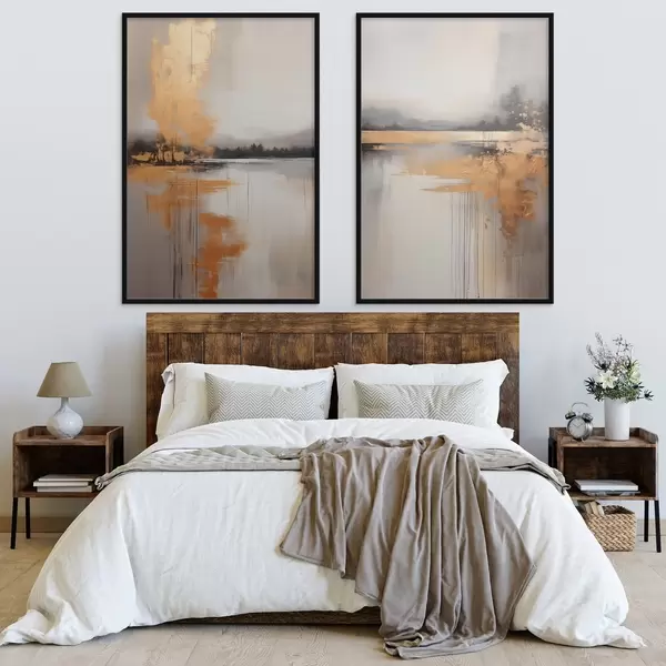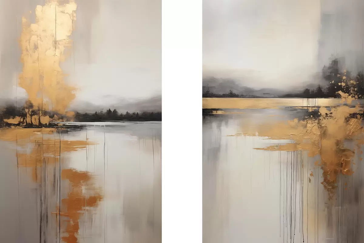 Poster Eine abstrakte Landschaft mit einem See, Baum und gelben Nebel, das Wasser spiegelt und bewölkten Himmel Nr d00657