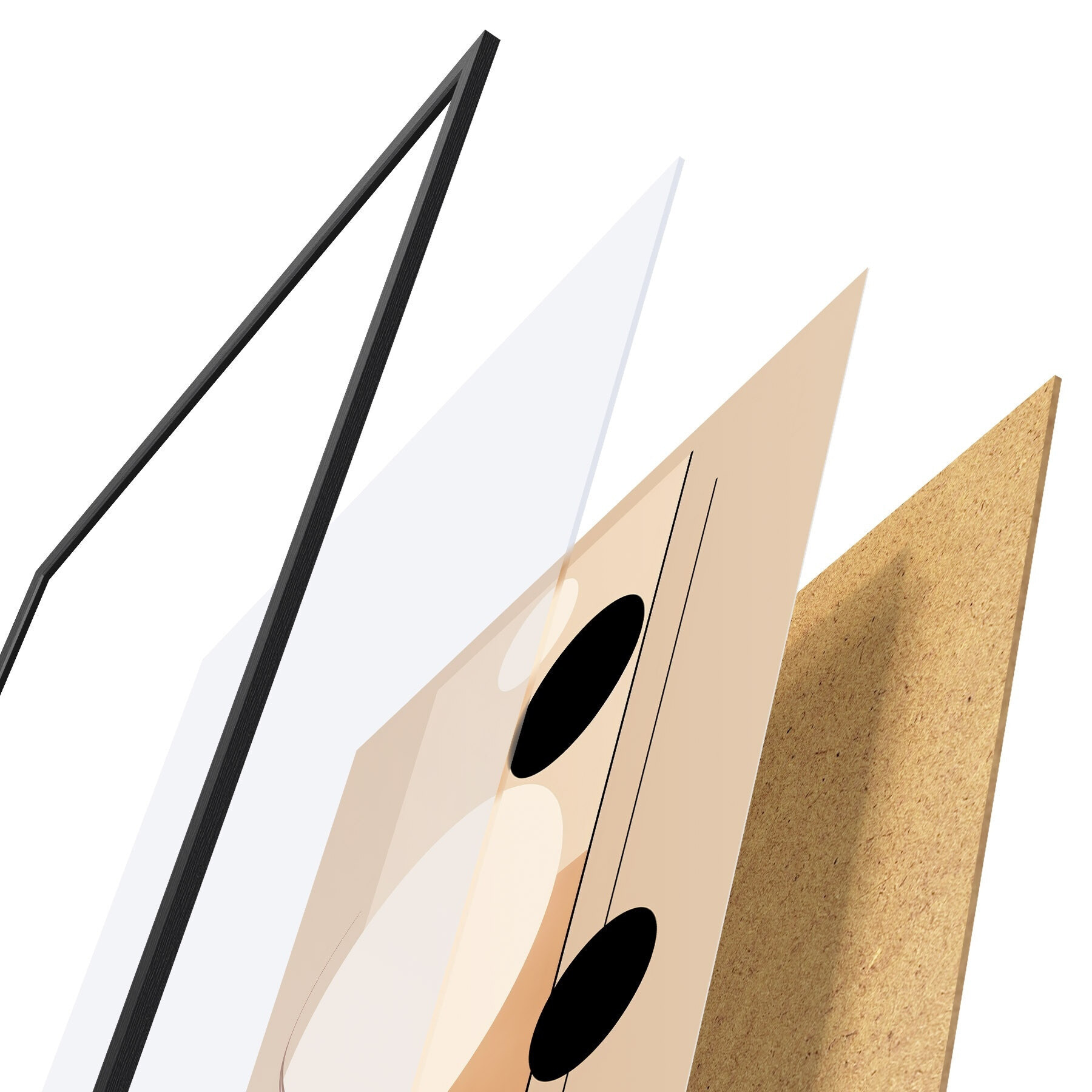 Das Poster besteht aus einem Rahmen, Plexiglas, einem gedruckten Bild und einer Rückwand aus Spanplatten. Dank der Halterungen auf der Rückseite kann das Poster sofort an die Wand gehängt werden.