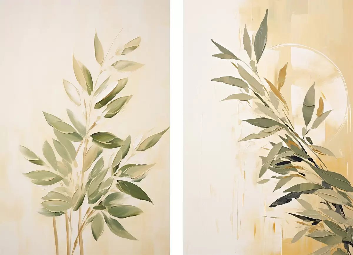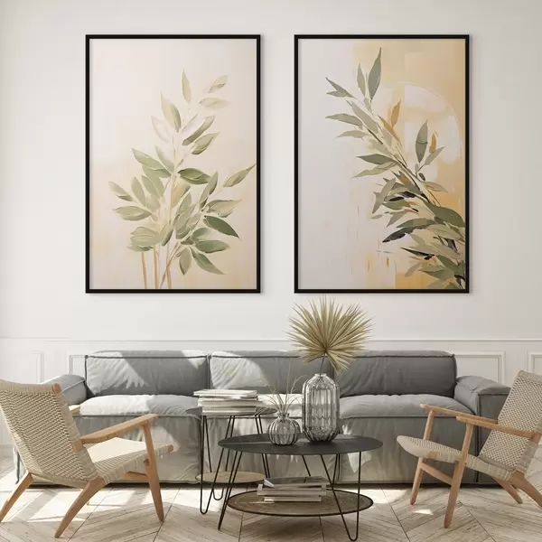 Poster Botanischer Zweig mit grünen Blättern auf einem warmen Hintergrund Nr d00686