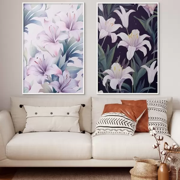 Poster Zarte rosa Lilien mit grünen Blättern auf hellem und dunklem Hintergrund Nr d00689