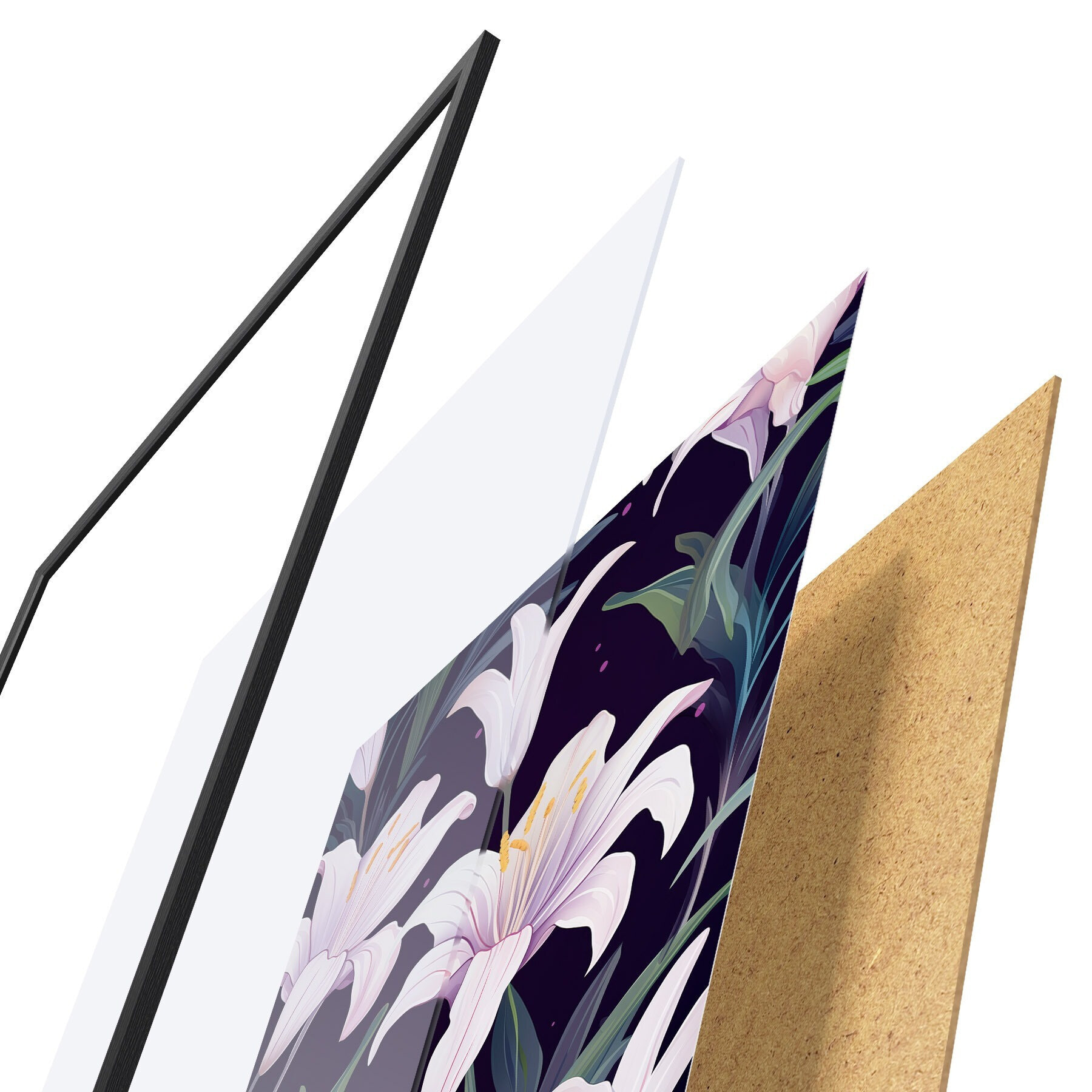 Das Poster besteht aus einem Rahmen, Plexiglas, einem gedruckten Bild und einer Rückwand aus Spanplatten. Dank der Halterungen auf der Rückseite kann das Poster sofort an die Wand gehängt werden.