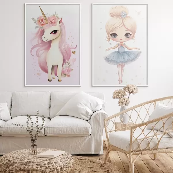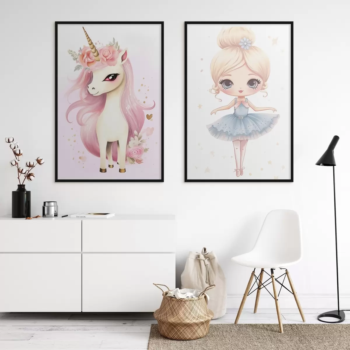Poster Ballerina-Puppe im blauen Kleid und Einhorn mit rosa Mähne Nr d00692