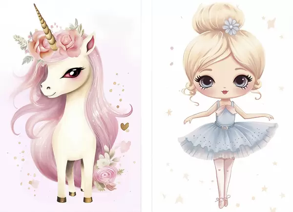 Poster Ballerina-Puppe im blauen Kleid und Einhorn mit rosa Mähne Nr d00692
