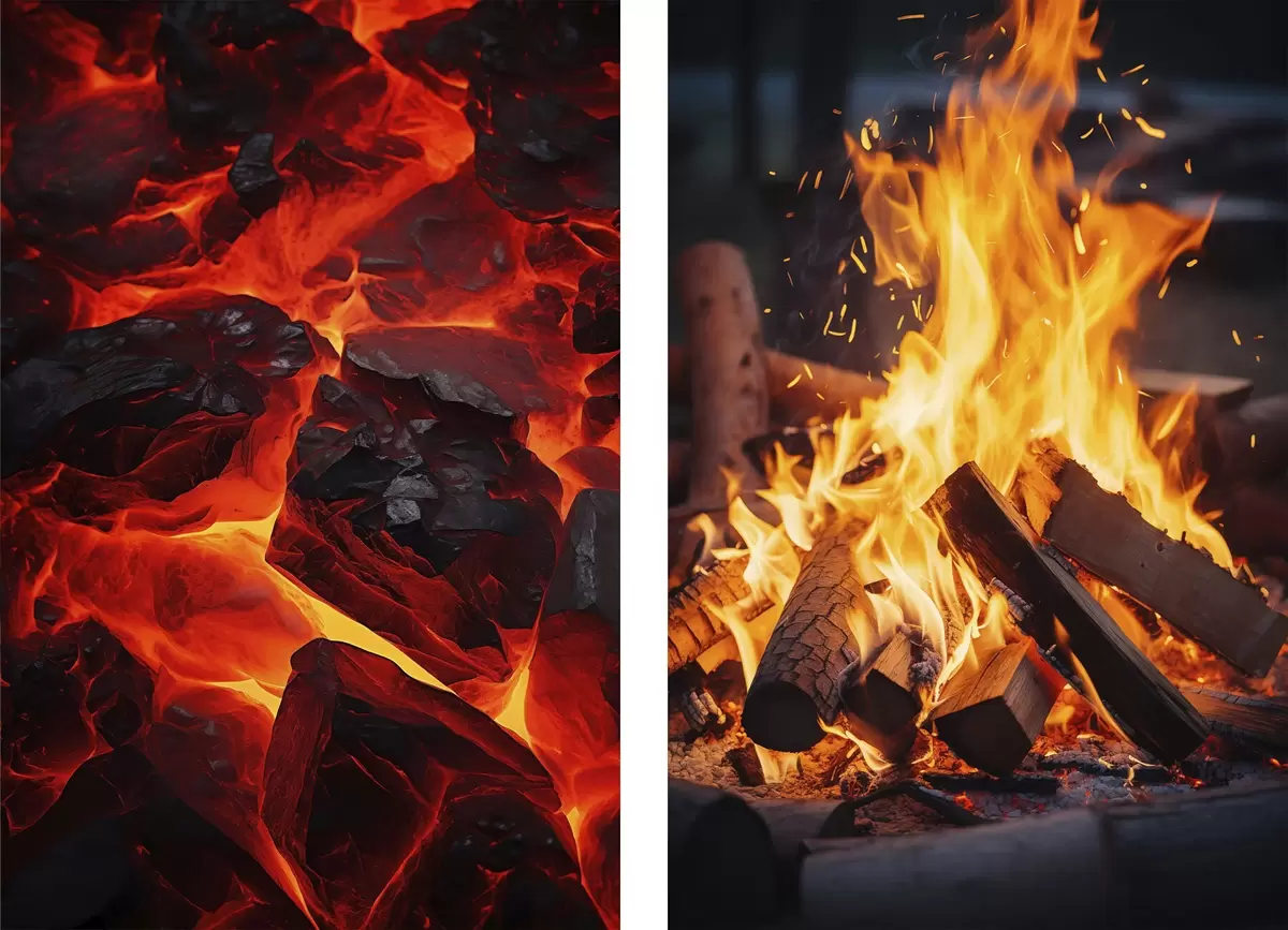 Poster Brennende Kohlen und flammendes Feuer in der Dunkelheit Nr d00696