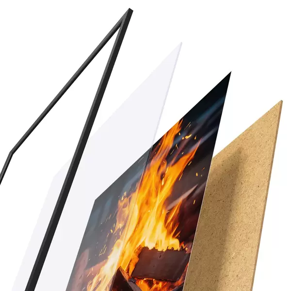 Das Poster besteht aus einem Rahmen, Plexiglas, einem gedruckten Bild und einer Rückwand aus Spanplatten. Dank der Halterungen auf der Rückseite kann das Poster sofort an die Wand gehängt werden.