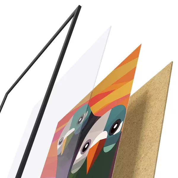 Das Poster besteht aus einem Rahmen, Plexiglas, einem gedruckten Bild und einer Rückwand aus Spanplatten. Dank der Halterungen auf der Rückseite kann das Poster sofort an die Wand gehängt werden.
