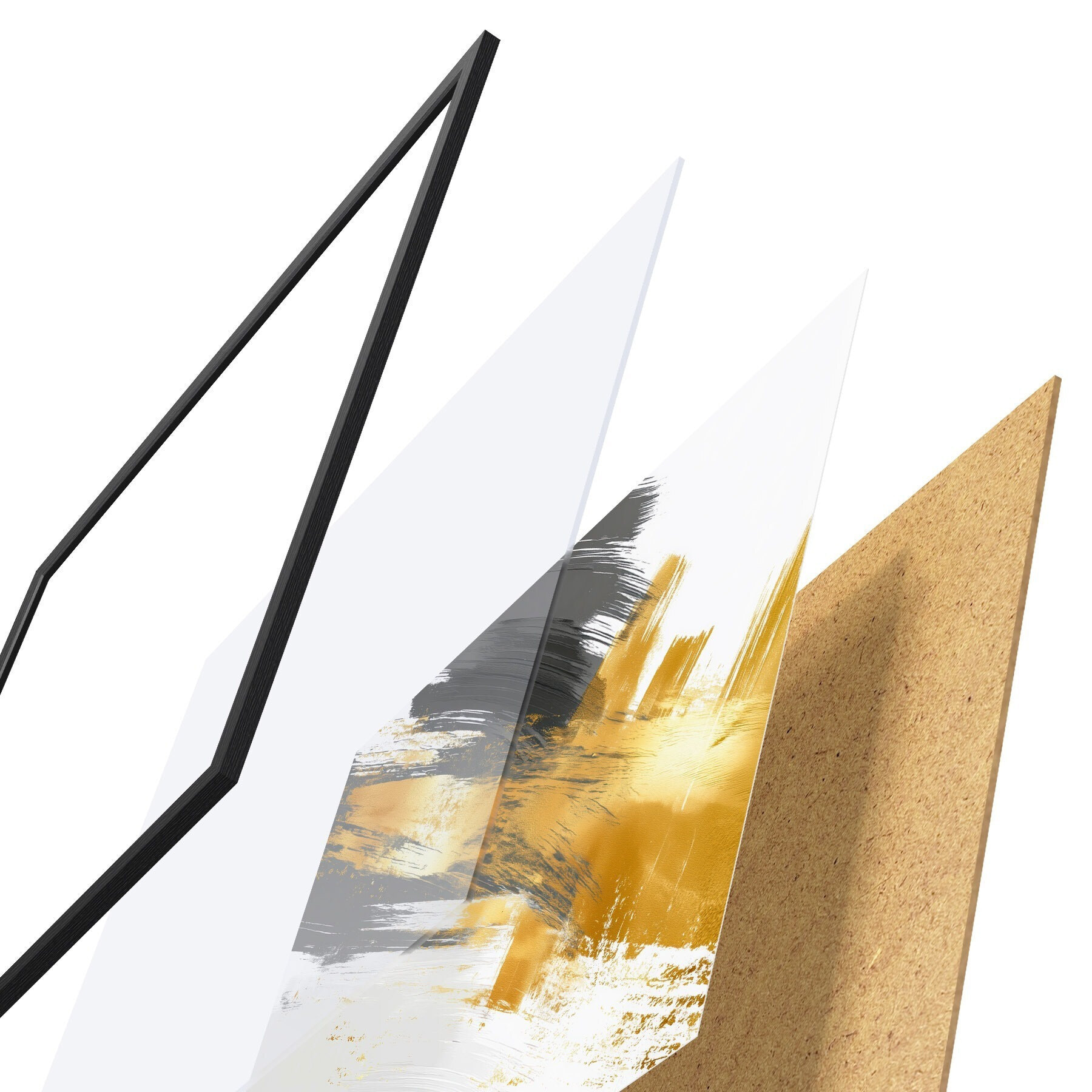 Das Poster besteht aus einem Rahmen, Plexiglas, einem gedruckten Bild und einer Rückwand aus Spanplatten. Dank der Halterungen auf der Rückseite kann das Poster sofort an die Wand gehängt werden.
