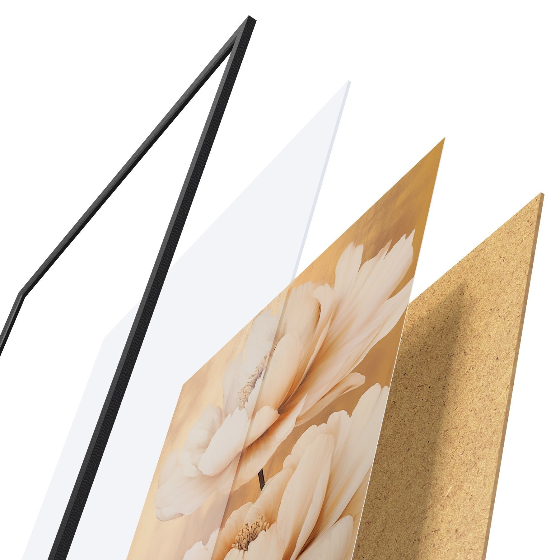 Das Poster besteht aus einem Rahmen, Plexiglas, einem gedruckten Bild und einer Rückwand aus Spanplatten. Dank der Halterungen auf der Rückseite kann das Poster sofort an die Wand gehängt werden.