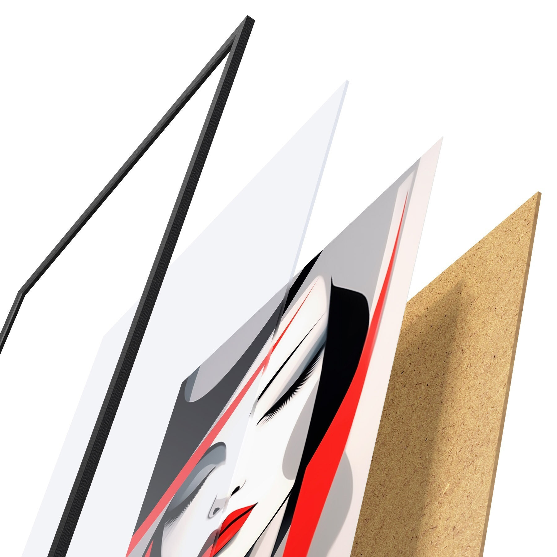 Das Poster besteht aus einem Rahmen, Plexiglas, einem gedruckten Bild und einer Rückwand aus Spanplatten. Dank der Halterungen auf der Rückseite kann das Poster sofort an die Wand gehängt werden.