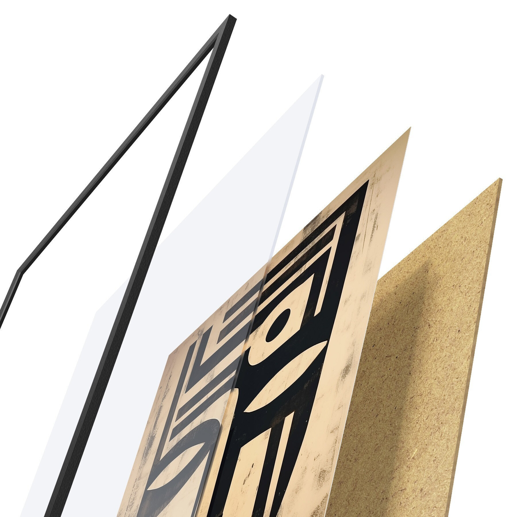 Das Poster besteht aus einem Rahmen, Plexiglas, einem gedruckten Bild und einer Rückwand aus Spanplatten. Dank der Halterungen auf der Rückseite kann das Poster sofort an die Wand gehängt werden.