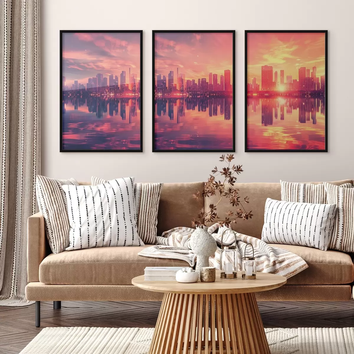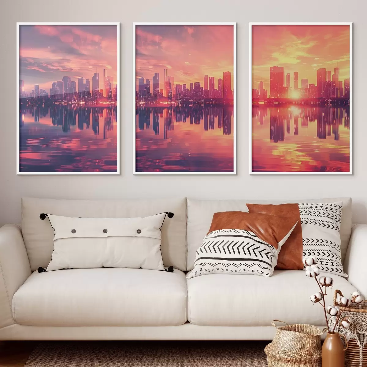 Poster Romantischer Sonnenuntergang mit einer modernen Stadt im Hintergrund d00784
