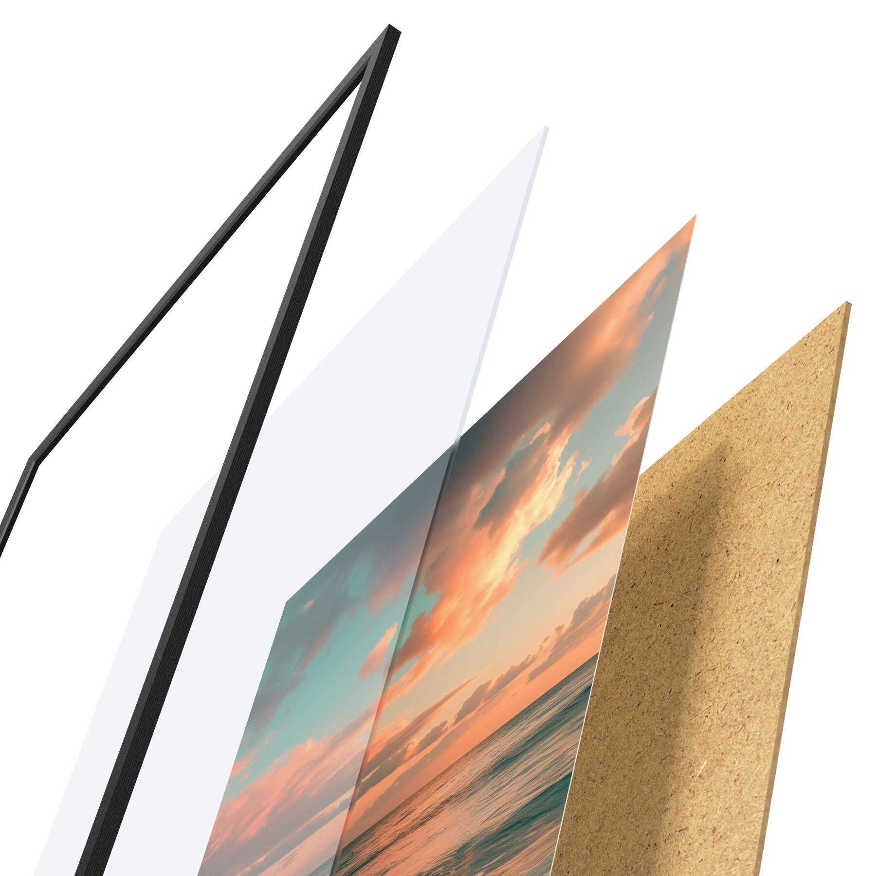 Das Poster besteht aus einem Rahmen, Plexiglas, einem gedruckten Bild und einer Rückwand aus Spanplatten. Dank der Halterungen auf der Rückseite kann das Poster sofort an die Wand gehängt werden.
