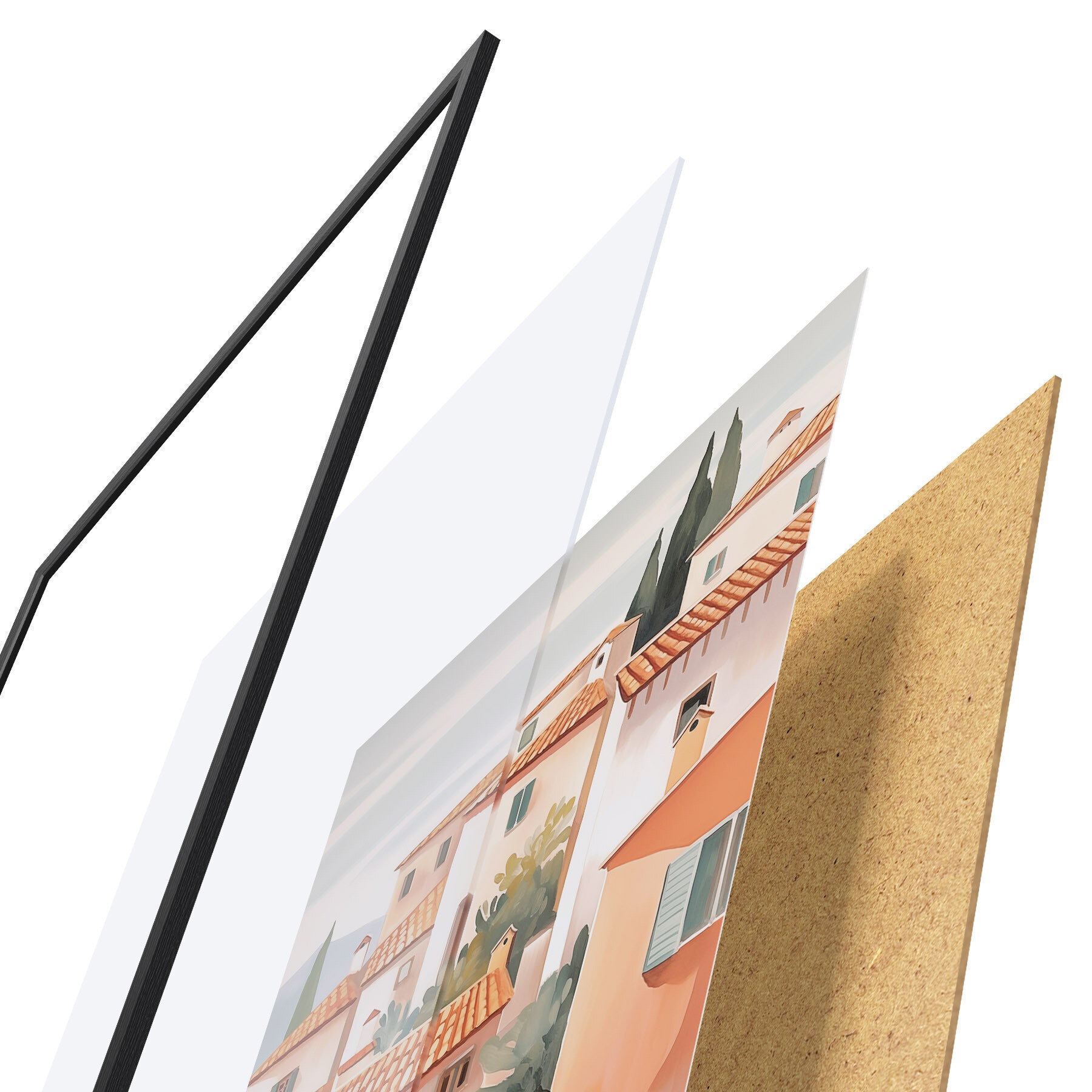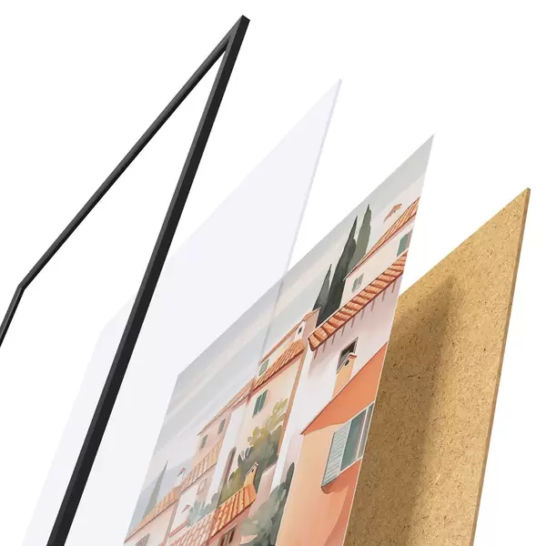 Das Poster besteht aus einem Rahmen, Plexiglas, einem gedruckten Bild und einer Rückwand aus Spanplatten. Dank der Halterungen auf der Rückseite kann das Poster sofort an die Wand gehängt werden.
