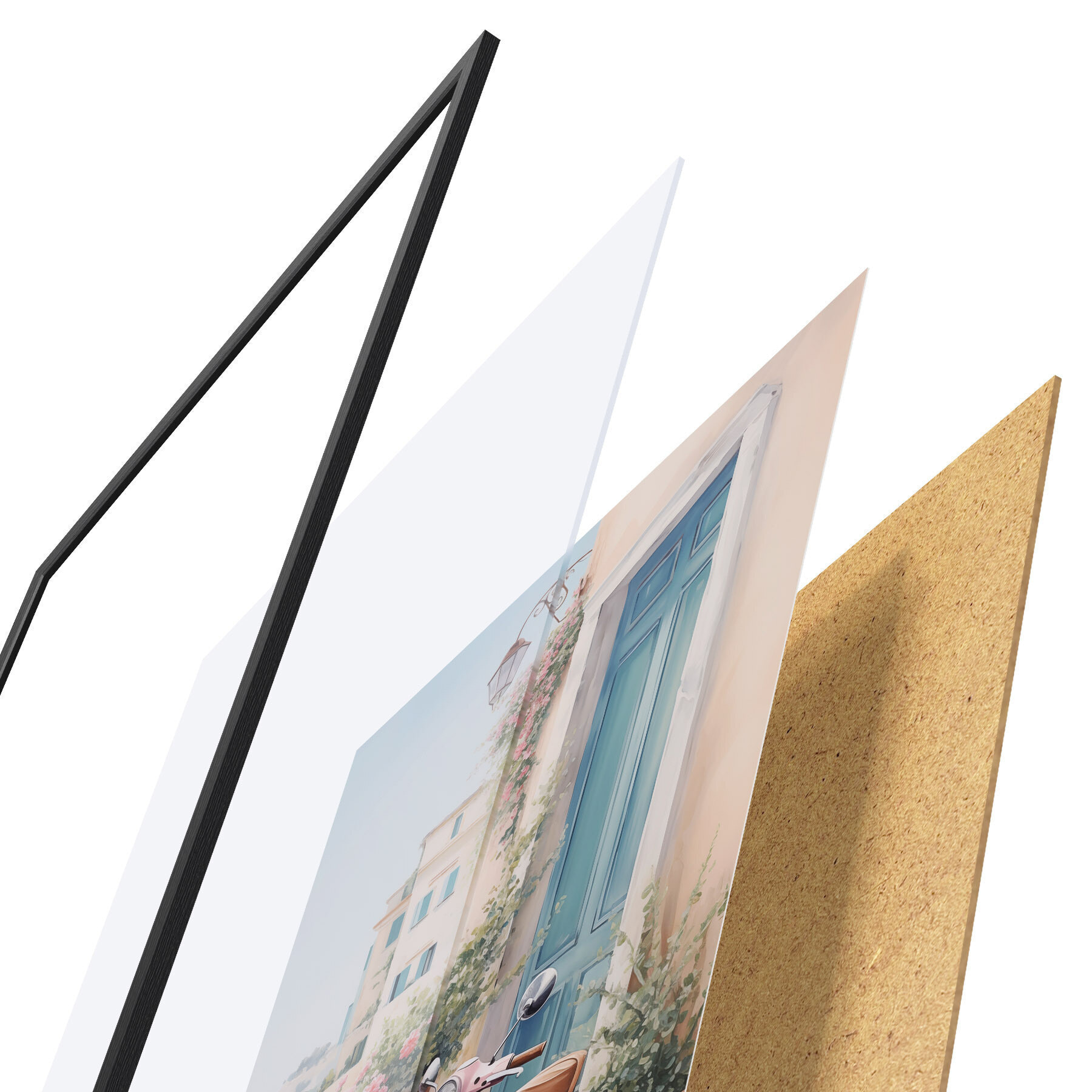 Das Poster besteht aus einem Rahmen, Plexiglas, einem gedruckten Bild und einer Rückwand aus Spanplatten. Dank der Halterungen auf der Rückseite kann das Poster sofort an die Wand gehängt werden.