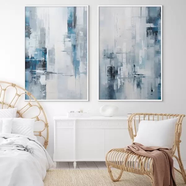 Poster Abstrakte Malerei-Imitation mit blauen, grauen und weißen Farben, vertikalen Linien und geometrischen Formen d00819