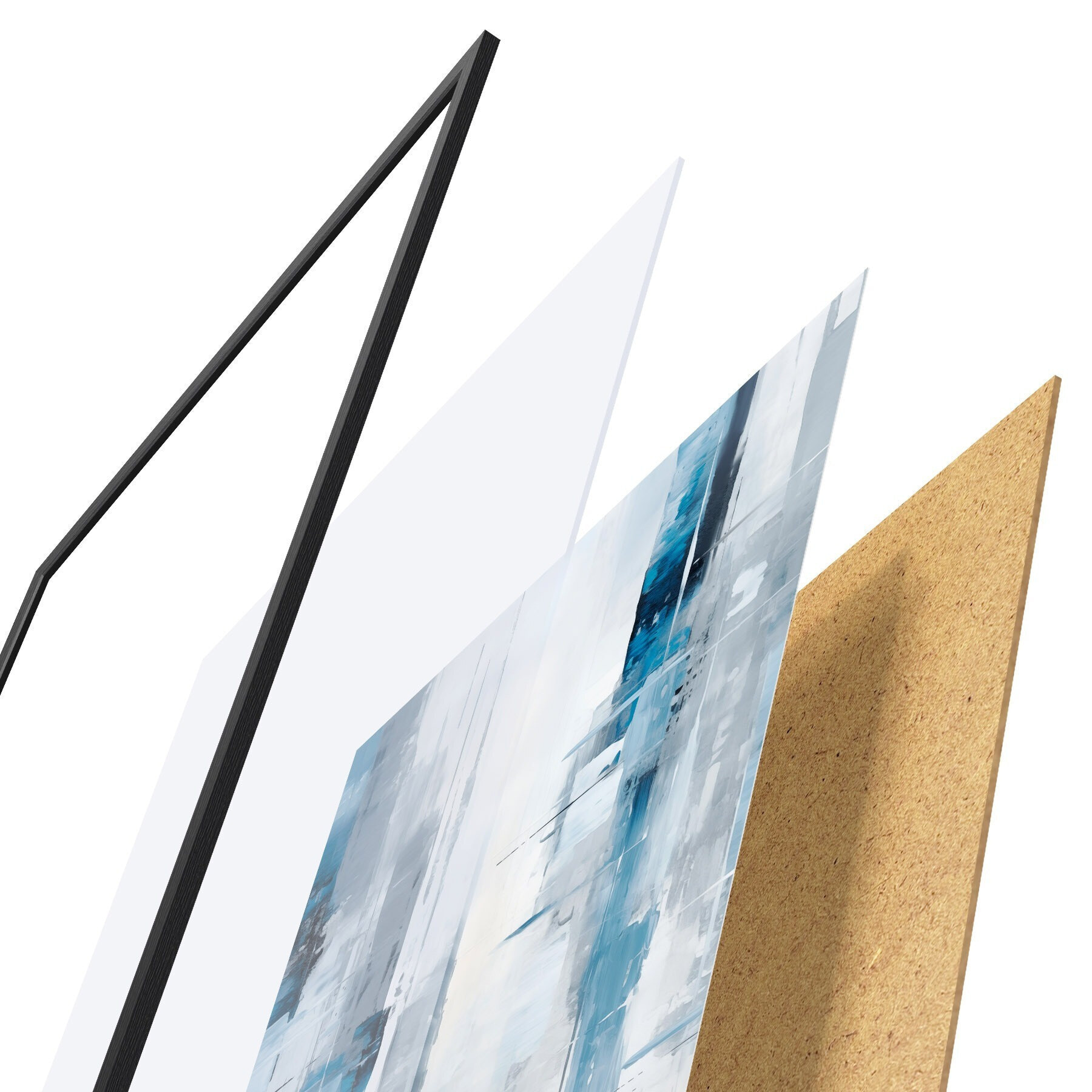 Das Poster besteht aus einem Rahmen, Plexiglas, einem gedruckten Bild und einer Rückwand aus Spanplatten. Dank der Halterungen auf der Rückseite kann das Poster sofort an die Wand gehängt werden.