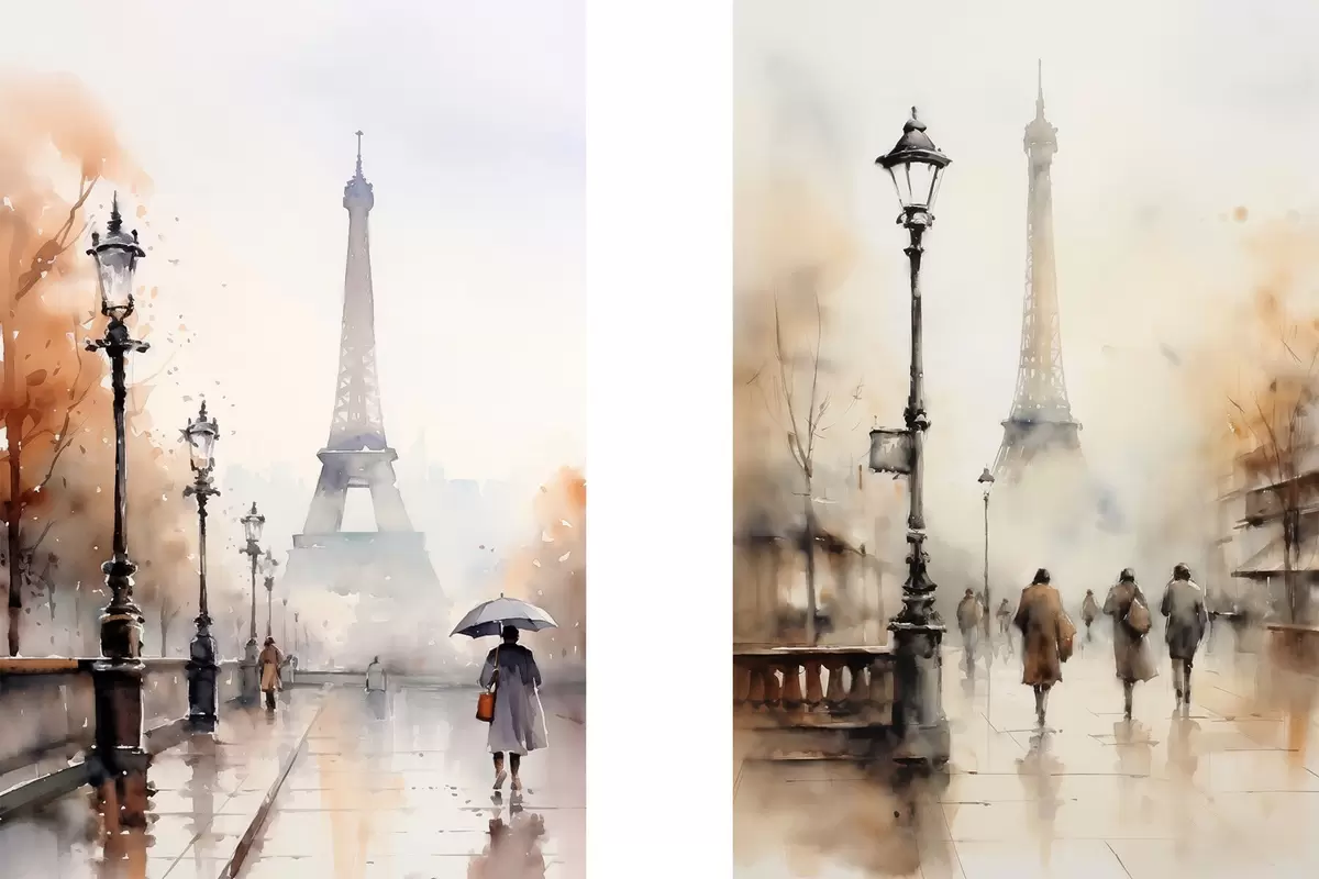 Poster Ein regnerischer Herbsttag in Paris mit dem Eiffelturm im Hintergrund und Vintage-Straßenlaternen Nr d00821