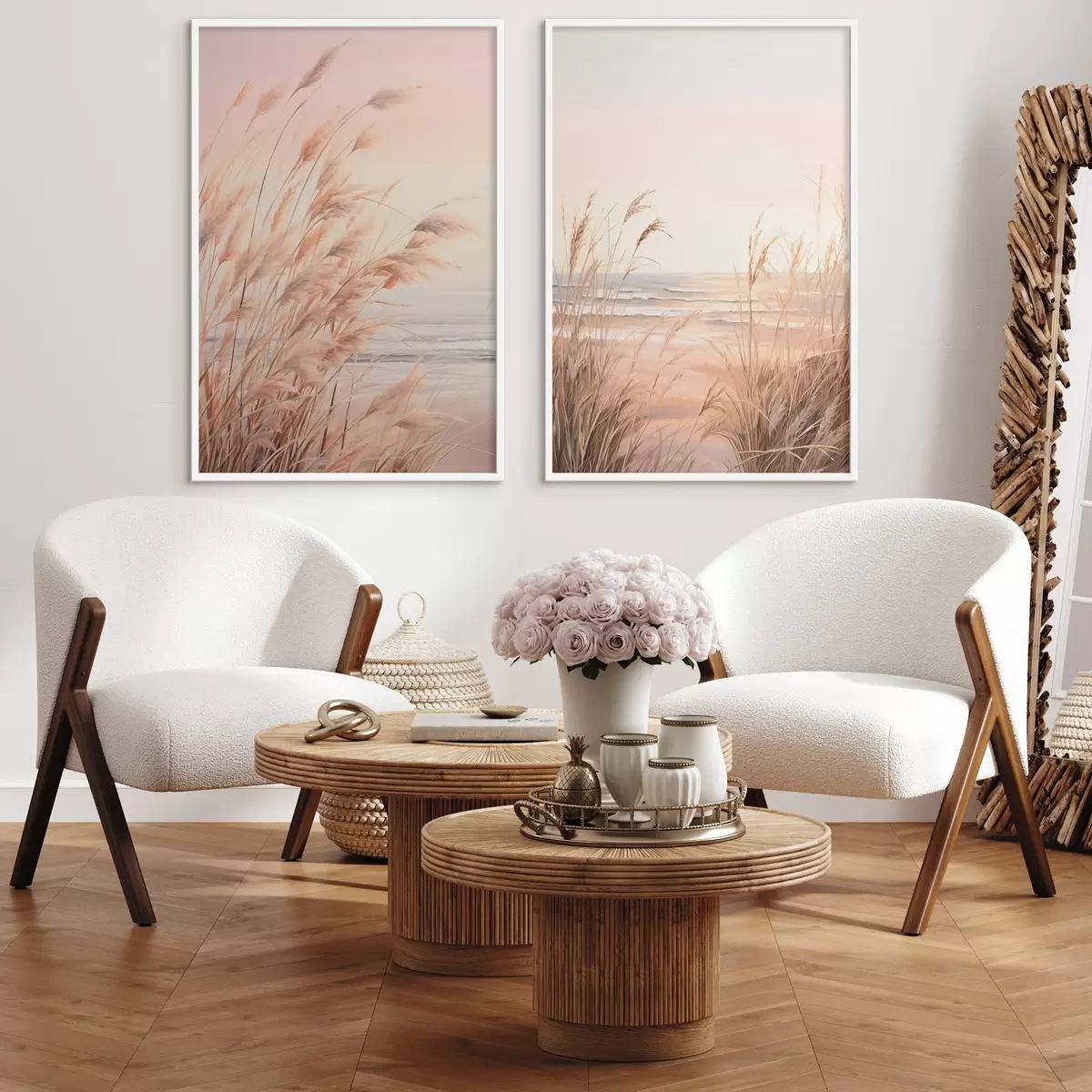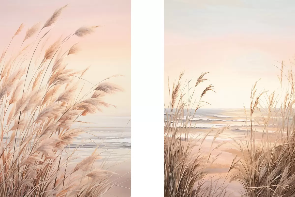 Poster Pampasgras mit pastelloranger Farbpalette, hellrosa Himmel, eine ruhige Landschaft d00823