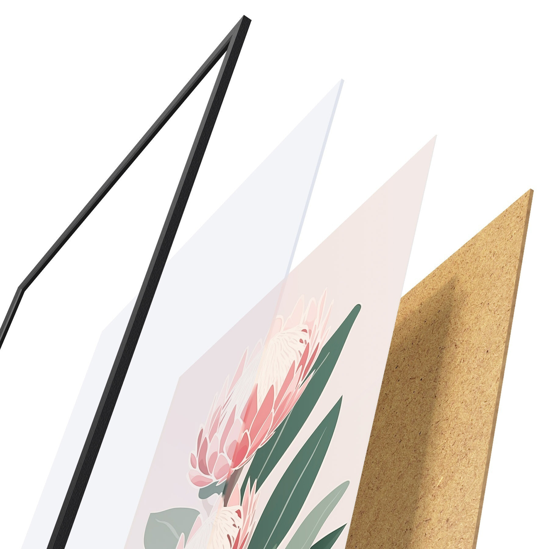 Das Poster besteht aus einem Rahmen, Plexiglas, einem gedruckten Bild und einer Rückwand aus Spanplatten. Dank der Halterungen auf der Rückseite kann das Poster sofort an die Wand gehängt werden.