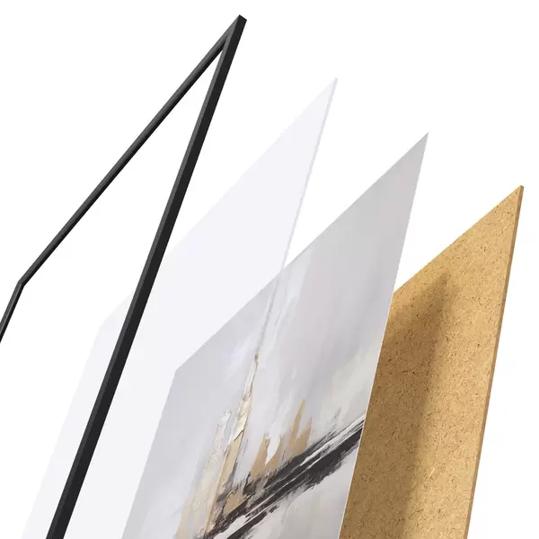 Das Poster besteht aus einem Rahmen, Plexiglas, einem gedruckten Bild und einer Rückwand aus Spanplatten. Dank der Halterungen auf der Rückseite kann das Poster sofort an die Wand gehängt werden.