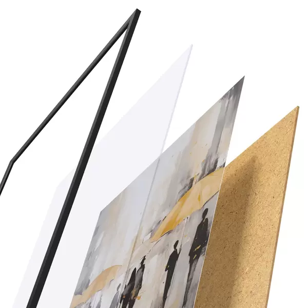 Das Poster besteht aus einem Rahmen, Plexiglas, einem gedruckten Bild und einer Rückwand aus Spanplatten. Dank der Halterungen auf der Rückseite kann das Poster sofort an die Wand gehängt werden.