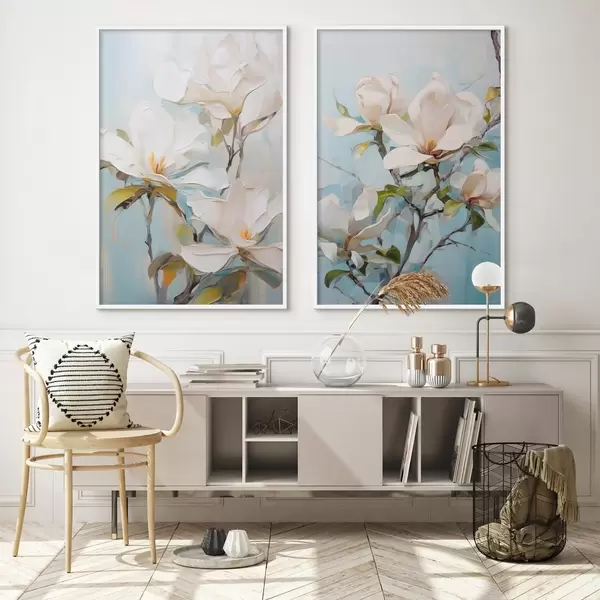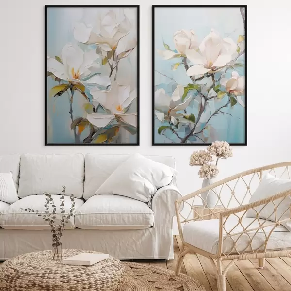 Poster Weiße Magnolienblüten, hellblauer Hintergrund mit sanften Pinselstrichen, Ölgemälde-Stil, pastose Textur d00881