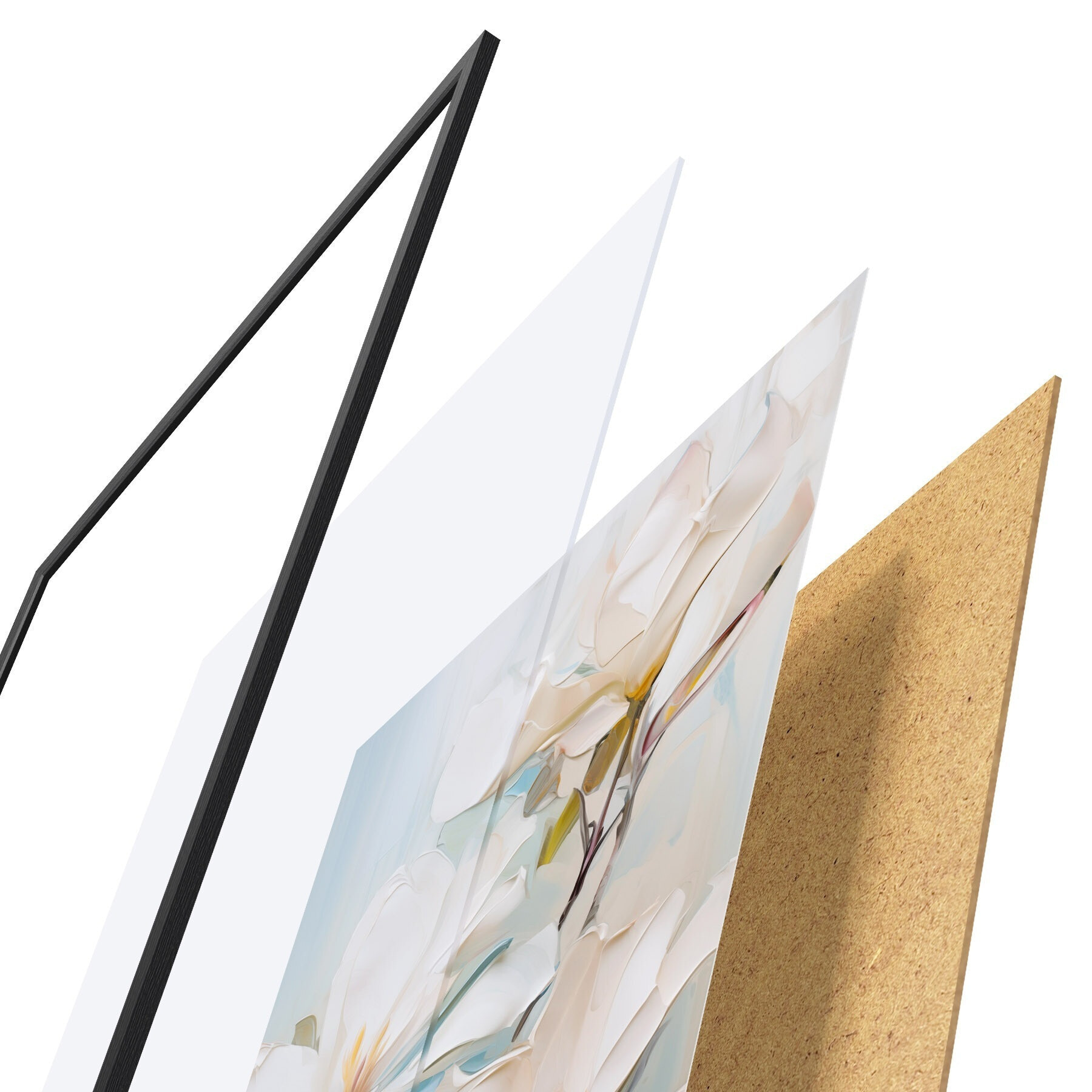 Das Poster besteht aus einem Rahmen, Plexiglas, einem gedruckten Bild und einer Rückwand aus Spanplatten. Dank der Halterungen auf der Rückseite kann das Poster sofort an die Wand gehängt werden.