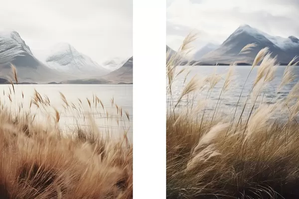 Poster Pampasgras mit einem See und Bergen im Hintergrund, sanfte Beleuchtung, gedämpfte Farben, naturalistischer Stil d00884