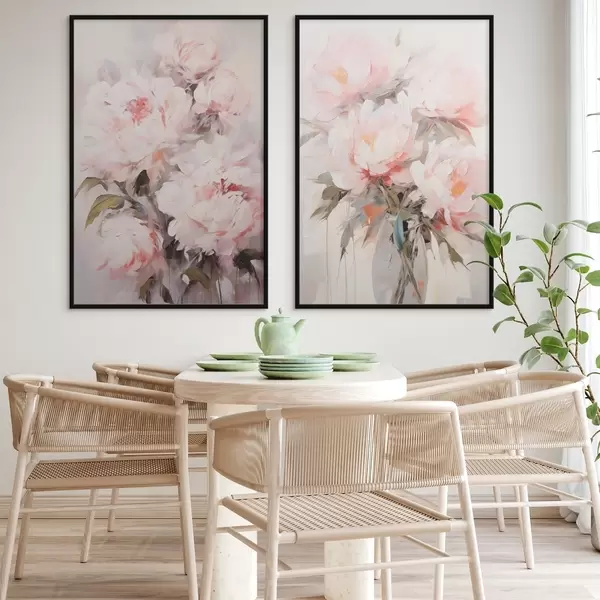 Poster Ein Strauß hellrosa Pfingstrosen mit grünen Blättern, sanfte Pinselstriche, Pastellfarben, auf hellem Hintergrund Nr d00890