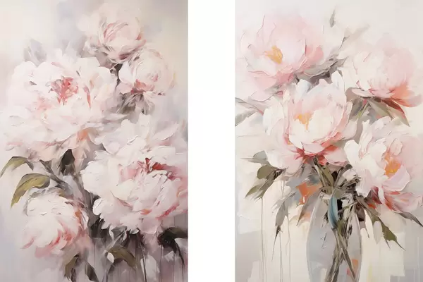 Poster Ein Strauß hellrosa Pfingstrosen mit grünen Blättern, sanfte Pinselstriche, Pastellfarben, auf hellem Hintergrund Nr d00890