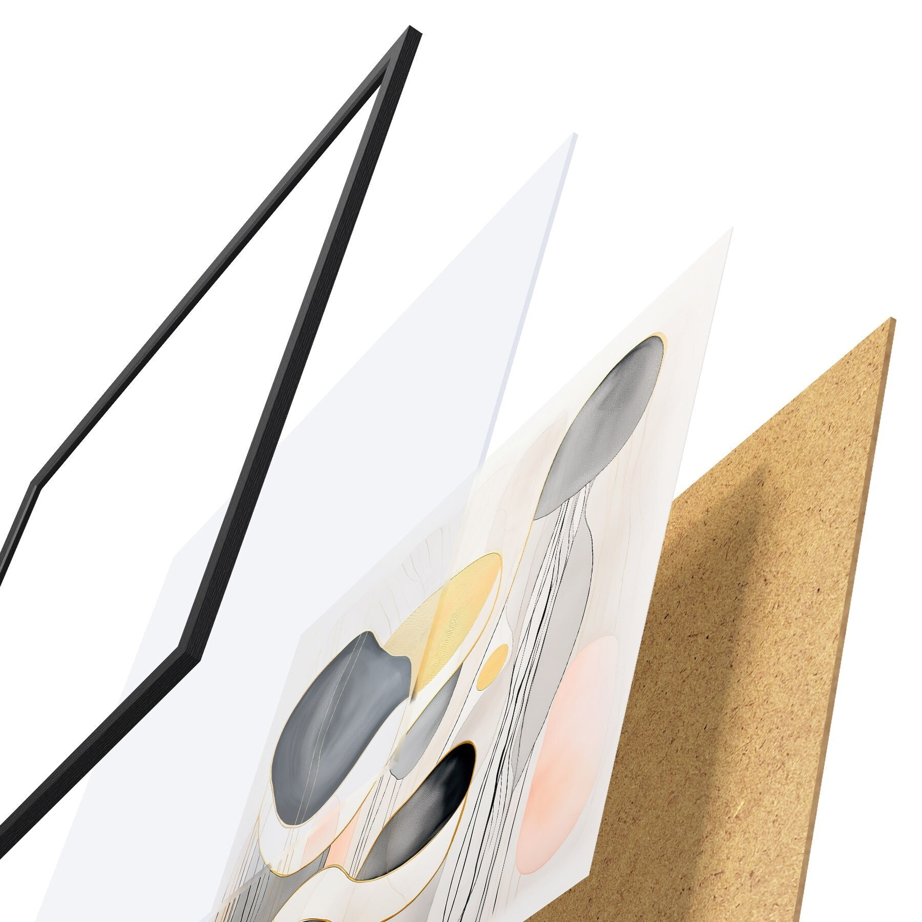Das Poster besteht aus einem Rahmen, Plexiglas, einem gedruckten Bild und einer Rückwand aus Spanplatten. Dank der Halterungen auf der Rückseite kann das Poster sofort an die Wand gehängt werden.