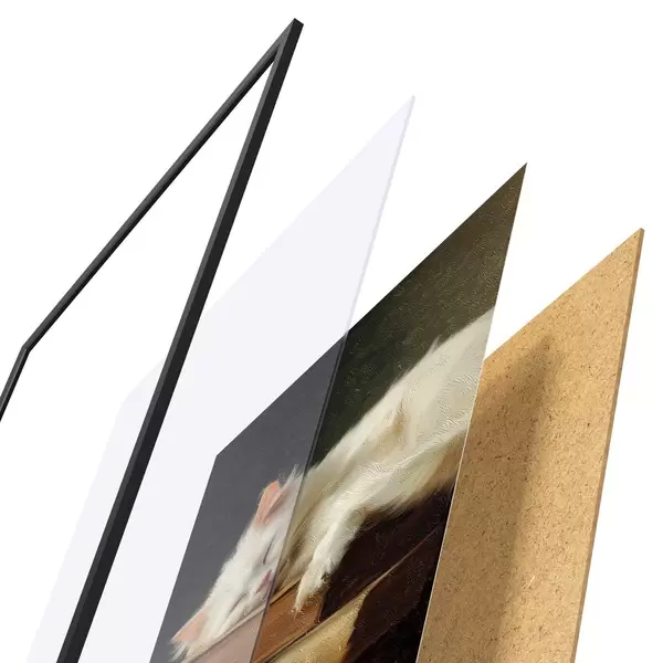 Das Poster besteht aus einem Rahmen, Plexiglas, einem gedruckten Bild und einer Rückwand aus Spanplatten. Dank der Halterungen auf der Rückseite kann das Poster sofort an die Wand gehängt werden.