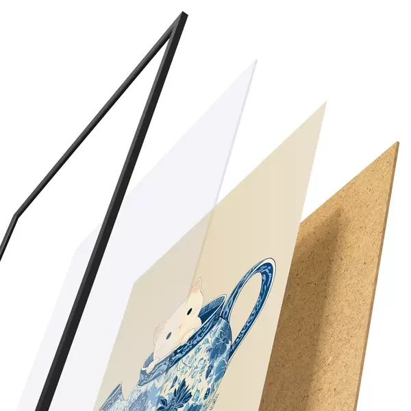 Das Poster besteht aus einem Rahmen, Plexiglas, einem gedruckten Bild und einer Rückwand aus Spanplatten. Dank der Halterungen auf der Rückseite kann das Poster sofort an die Wand gehängt werden.