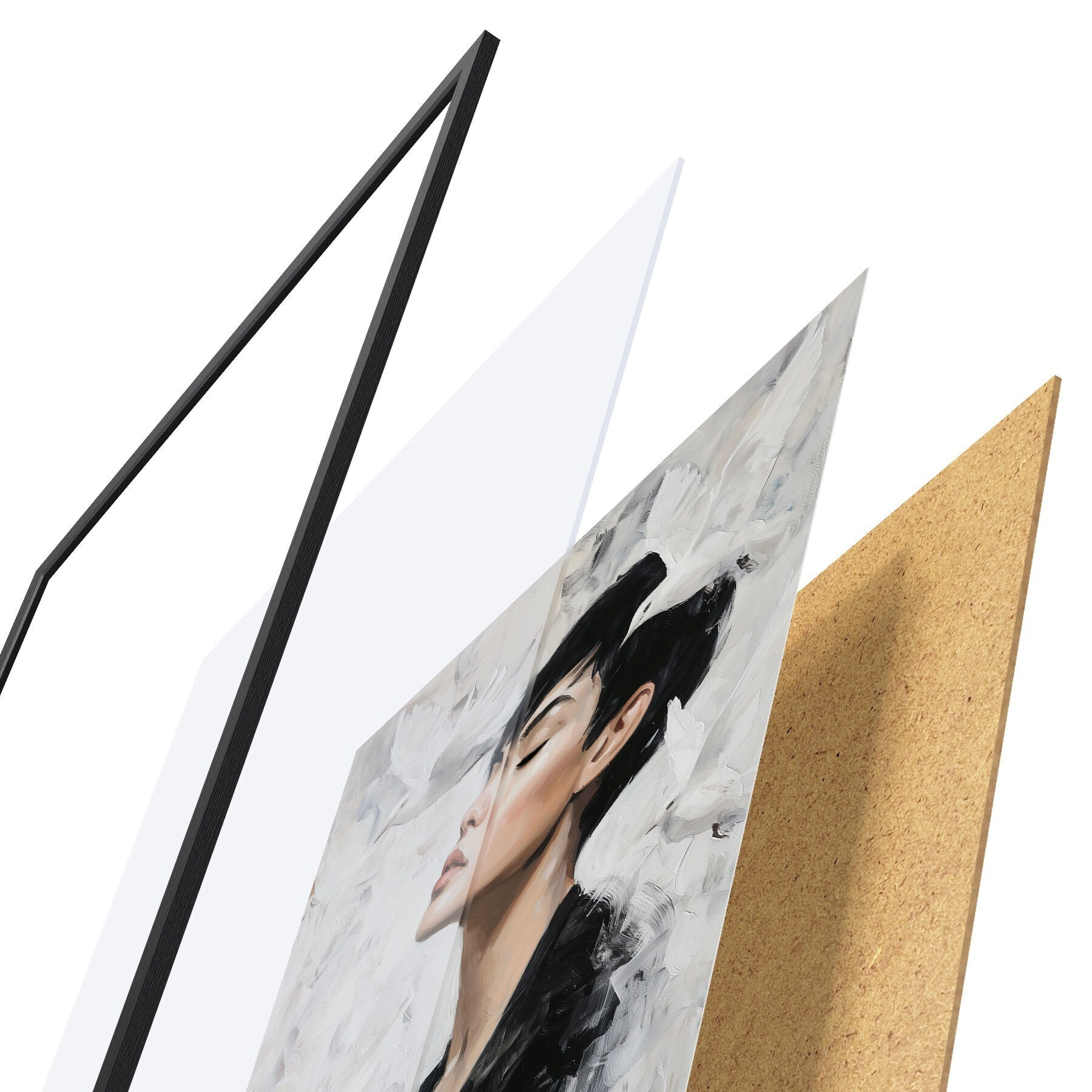 Das Poster besteht aus einem Rahmen, Plexiglas, einem gedruckten Bild und einer Rückwand aus Spanplatten. Dank der Halterungen auf der Rückseite kann das Poster sofort an die Wand gehängt werden.