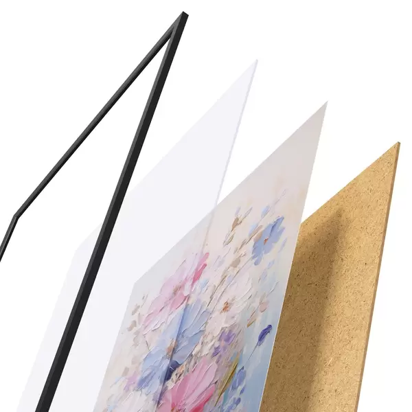 Das Poster besteht aus einem Rahmen, Plexiglas, einem gedruckten Bild und einer Rückwand aus Spanplatten. Dank der Halterungen auf der Rückseite kann das Poster sofort an die Wand gehängt werden.