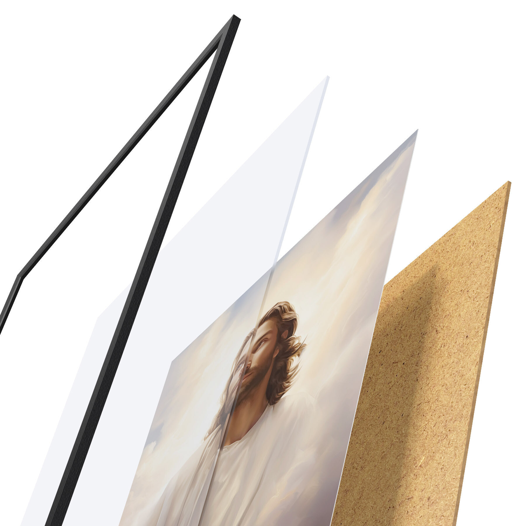 Das Poster besteht aus einem Rahmen, Plexiglas, einem gedruckten Bild und einer Rückwand aus Spanplatten. Dank der Halterungen auf der Rückseite kann das Poster sofort an die Wand gehängt werden.