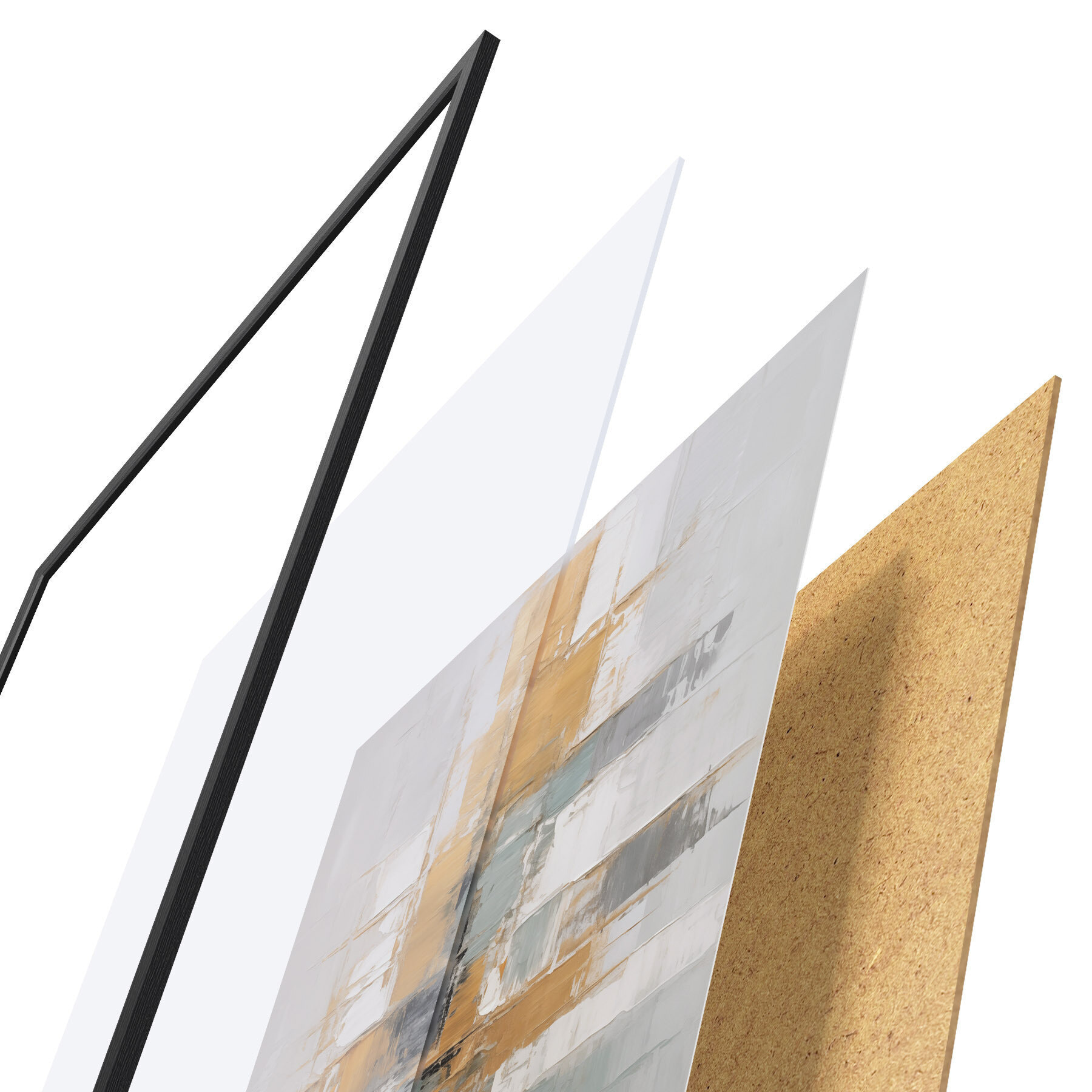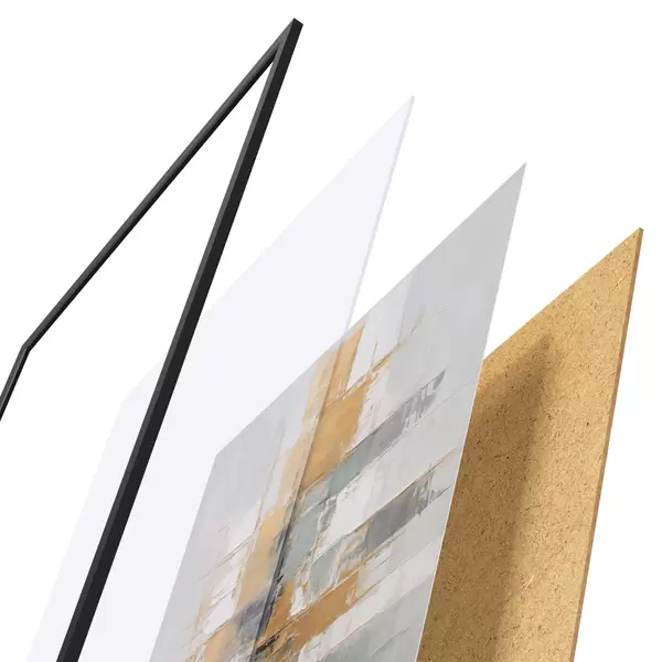 Das Poster besteht aus einem Rahmen, Plexiglas, einem gedruckten Bild und einer Rückwand aus Spanplatten. Dank der Halterungen auf der Rückseite kann das Poster sofort an die Wand gehängt werden.