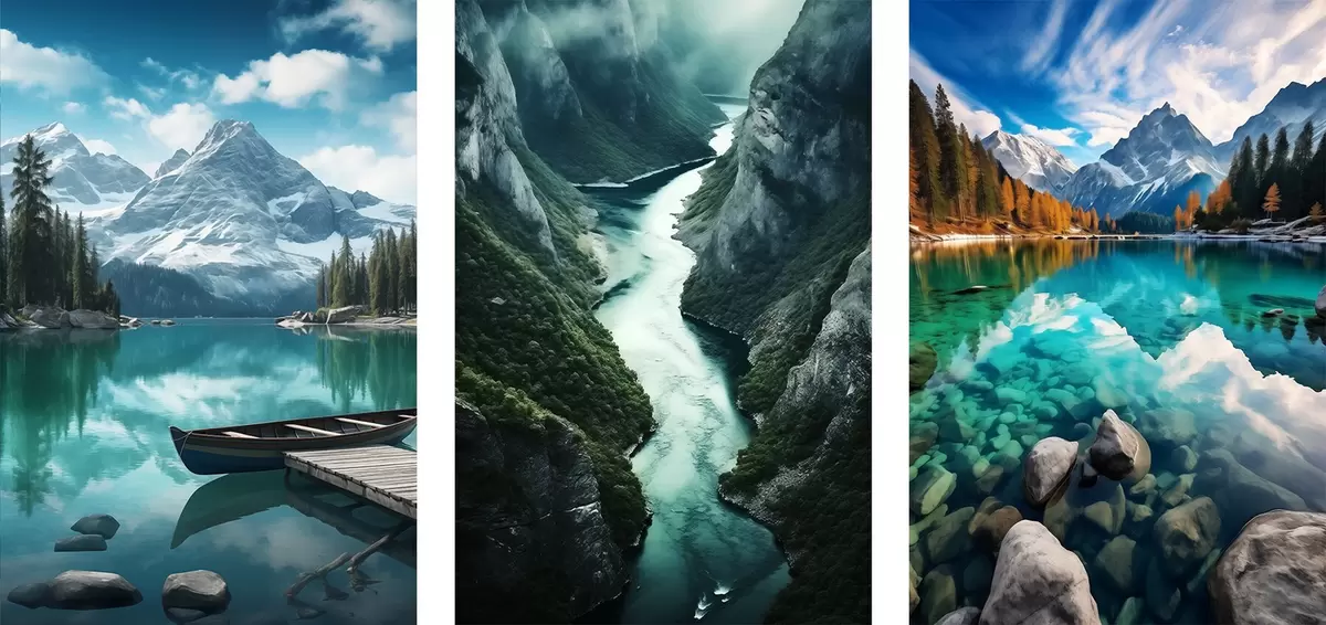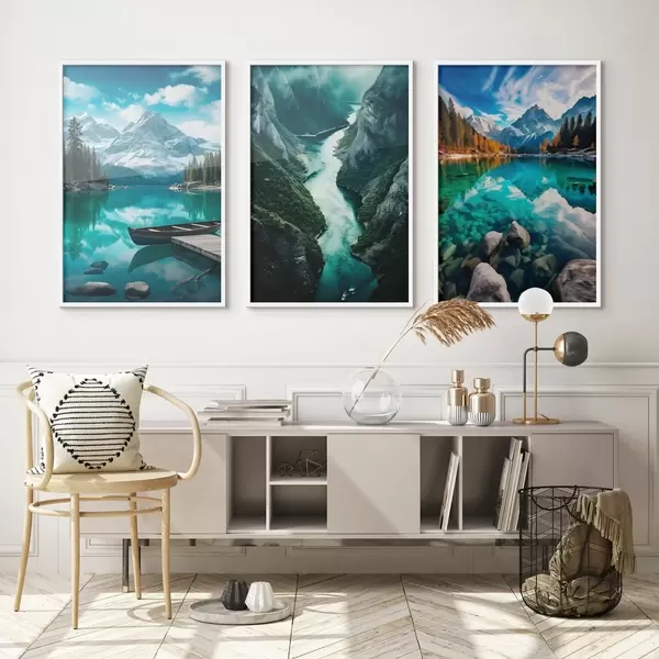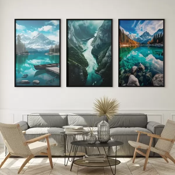 Poster Alpenseen und Fjordaussichten in kühlen Blaugrüntönen d00961